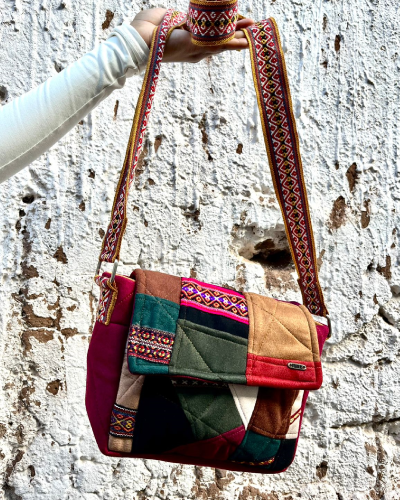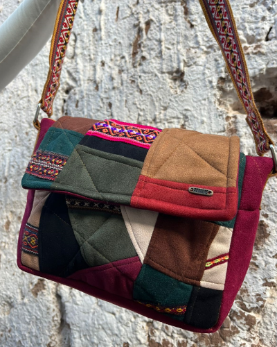 Made from scraps of fabric, patchwork technique. Alpaca and wool fabrics in scraps, a modern and colorful fusion of our culture.